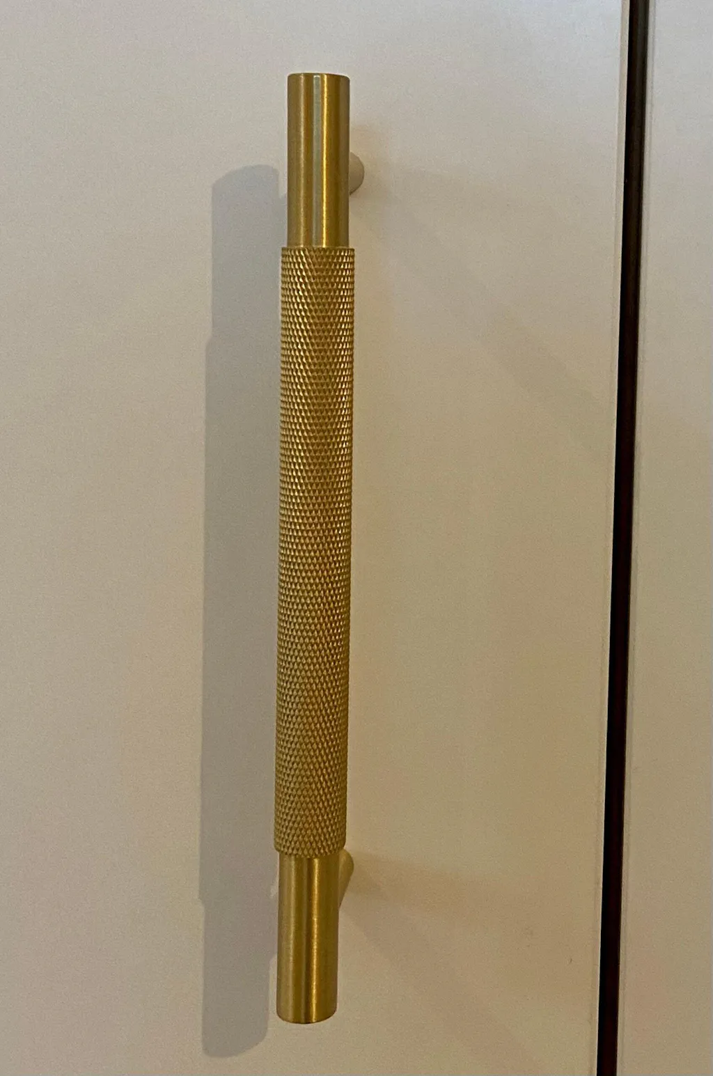 Beautiful detailed handles, forged from solid brass with fine knurled finish. The heavy weight handles add a feel of luxury to your kitchen cabinets or sideboard.